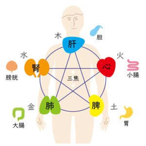 頭の先から足の先まで、体は繋がっています。内臓も然り。肝臓、心臓、脾臓、肺、腎臓が繋がっており、自然界の「木・火・土・金・水」の関係性と同じである、という考え方。また、これらの臓器に病因(外因・内因)が負荷をかけることでその症状が多様化していきます。外因とは、外からの影響(季節、気温・気圧、生活環境、など)で、内因とは内からの影響(食べ物、ストレス(気持ち)、薬、など)です。