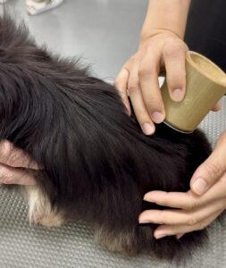 犬や猫も人と同様に体の側面に経穴があります。経穴とは血の巡りや内臓が陰陽で繋がっているところです。中医学ではこの経穴に針を打つことで溜まった邪を取り除いたり、温灸で血液やリンパの流れを良くしたりします。私たちが良く行なっているマッサージも血液やリンパの流れを良くしますが似たところがあります。
